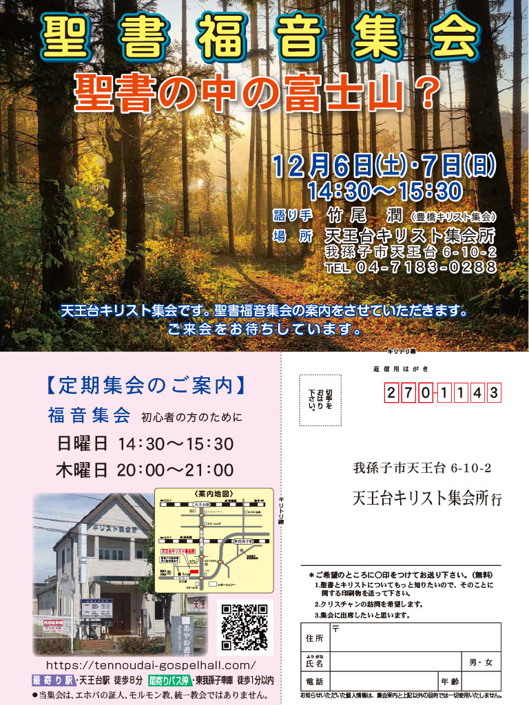 こんにちは。我孫子市にある天王台キリスト集会です。最新の聖書福音集会のご案内です。