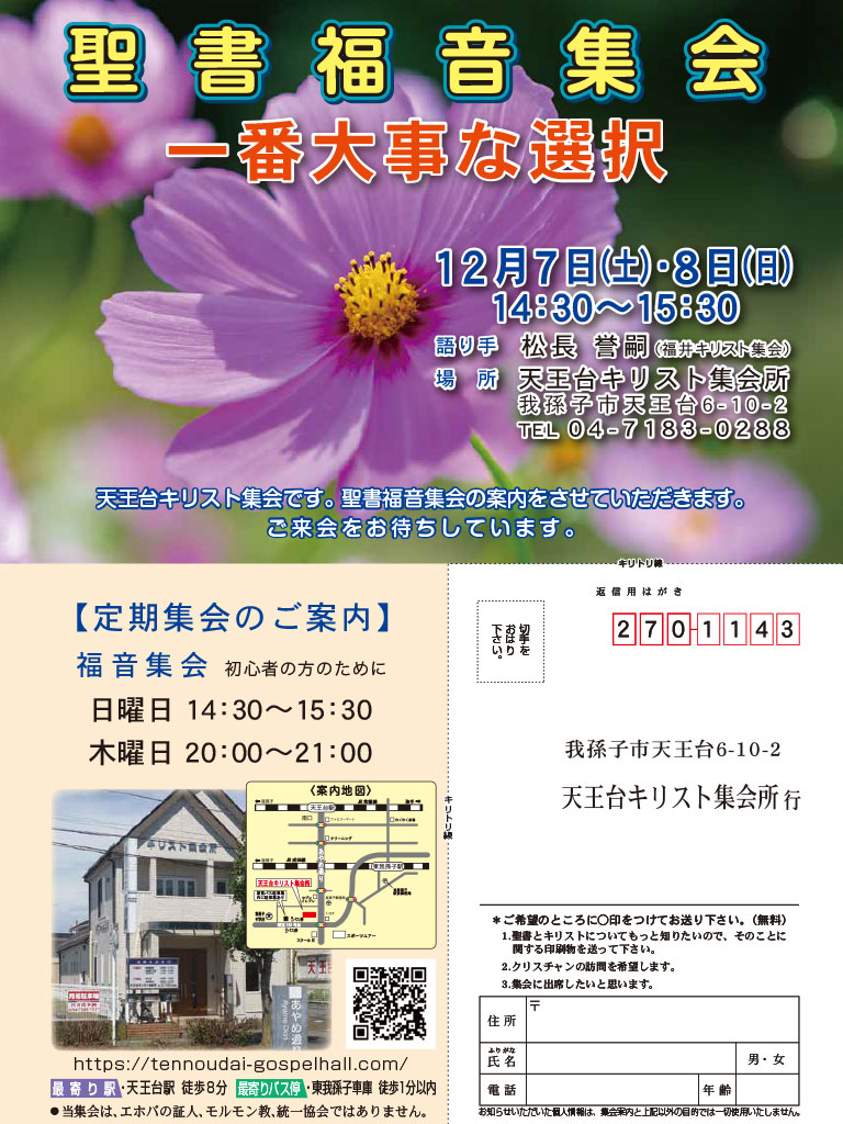 こんにちは。我孫子市にある天王台キリスト集会です。最新の聖書福音集会のご案内です。